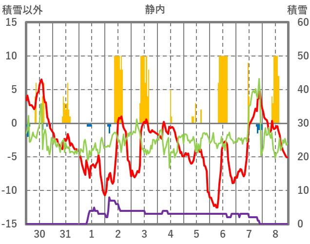 | 日 | 時 | 気温 | 降水 | 風向/風速 | 日照 | 積雪 | 降雪 |