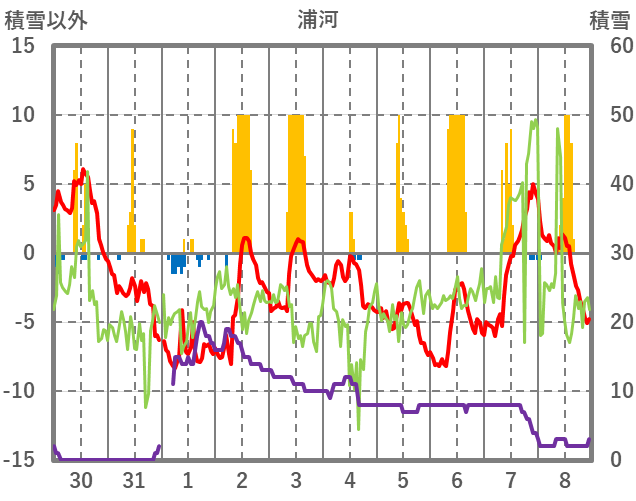 | 日 | 時 | 気温 | 降水 | 風向/風速 | 日照 | 積雪 | 降雪 |