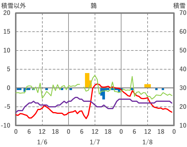 | 日 | 時 | 気温 | 降水 | 風向/風速 | 日照 | 積雪 | 降雪 |