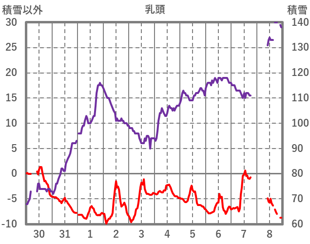 | 日 | 時 | 気温 | 降水 | 風向/風速 | 日照 | 積雪 | 降雪 |