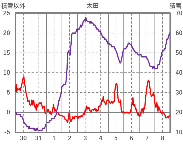 | 日 | 時 | 気温 | 降水 | 風向/風速 | 日照 | 積雪 | 降雪 |