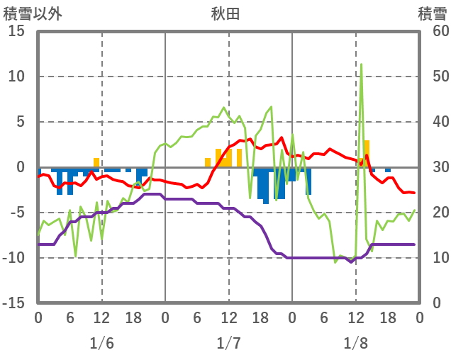 | 日 | 時 | 気温 | 降水 | 風向/風速 | 日照 | 積雪 | 降雪 |