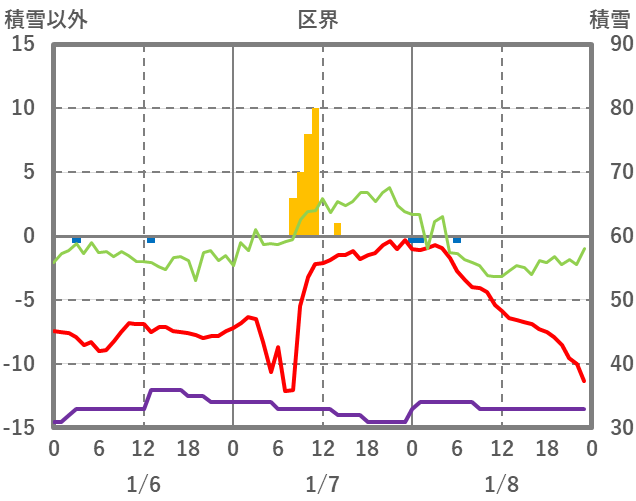 | 日 | 時 | 気温 | 降水 | 風向/風速 | 日照 | 積雪 | 降雪 |