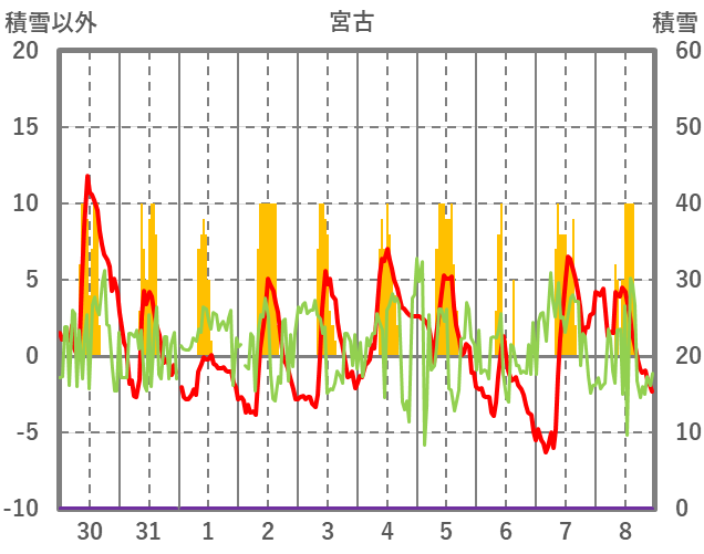 | 日 | 時 | 気温 | 降水 | 風向/風速 | 日照 | 積雪 | 降雪 |