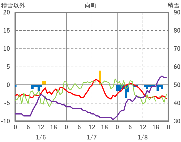 | 日 | 時 | 気温 | 降水 | 風向/風速 | 日照 | 積雪 | 降雪 |