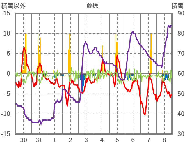 | 日 | 時 | 気温 | 降水 | 風向/風速 | 日照 | 積雪 | 降雪 |