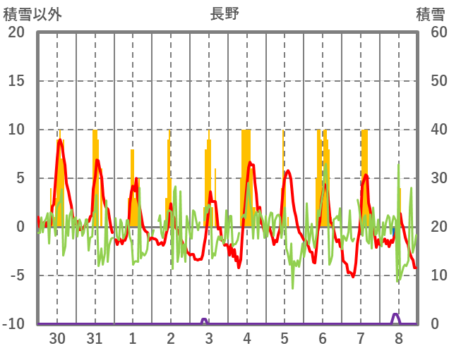 | 日 | 時 | 気温 | 降水 | 風向/風速 | 日照 | 積雪 | 降雪 |