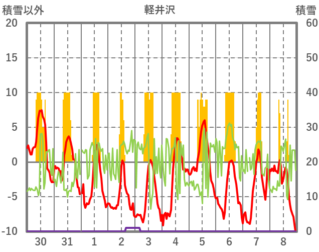 | 日 | 時 | 気温 | 降水 | 風向/風速 | 日照 | 積雪 | 降雪 |