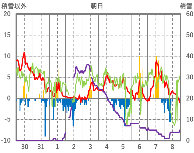 | 日 | 時 | 気温 | 降水 | 風向/風速 | 日照 | 積雪 | 降雪 |