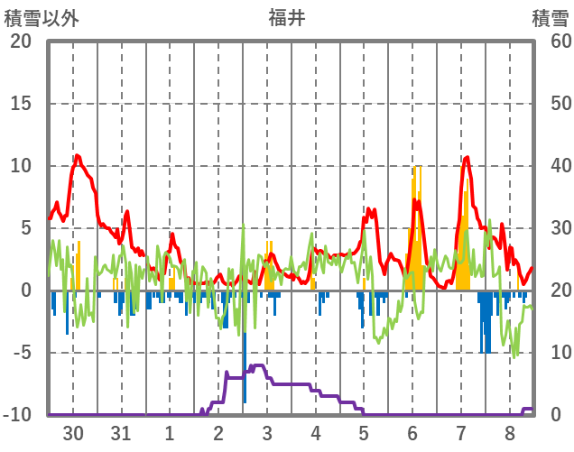 | 日 | 時 | 気温 | 降水 | 風向/風速 | 日照 | 積雪 | 降雪 |