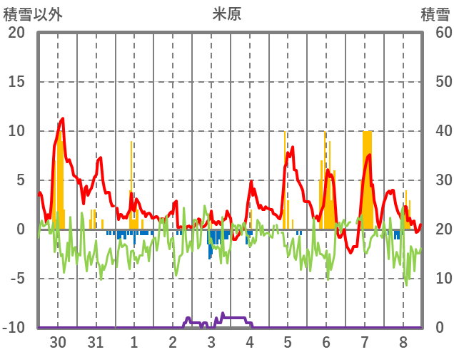 | 日 | 時 | 気温 | 降水 | 風向/風速 | 日照 | 積雪 | 降雪 |