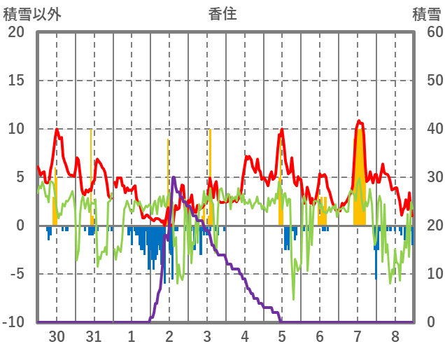 | 日 | 時 | 気温 | 降水 | 風向/風速 | 日照 | 積雪 | 降雪 |