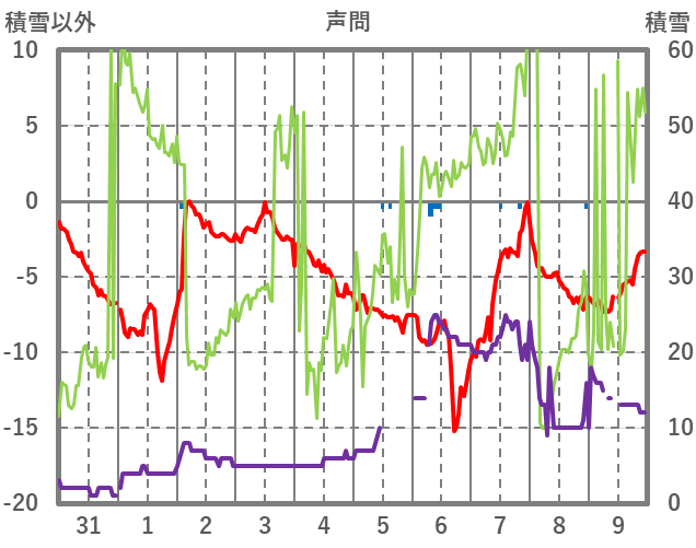 | 日 | 時 | 気温 | 降水 | 風向/風速 | 日照 | 積雪 | 降雪 |