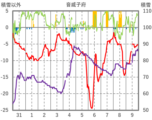 | 日 | 時 | 気温 | 降水 | 風向/風速 | 日照 | 積雪 | 降雪 |