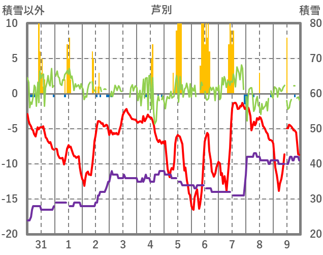 | 日 | 時 | 気温 | 降水 | 風向/風速 | 日照 | 積雪 | 降雪 |