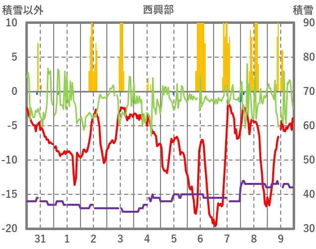 | 日 | 時 | 気温 | 降水 | 風向/風速 | 日照 | 積雪 | 降雪 |