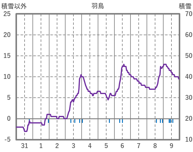 | 日 | 時 | 気温 | 降水 | 風向/風速 | 日照 | 積雪 | 降雪 |