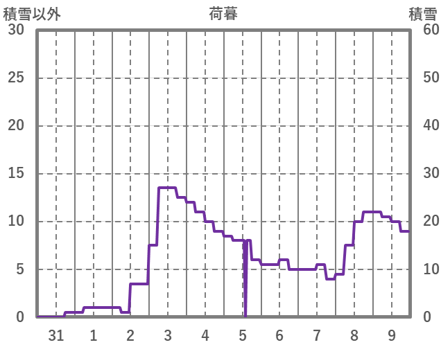 | 日 | 時 | 気温 | 降水 | 風向/風速 | 日照 | 積雪 | 降雪 |