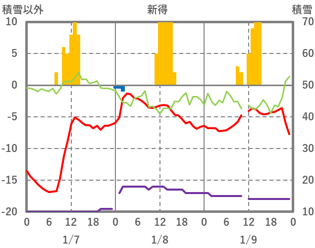 | 日 | 時 | 気温 | 降水 | 風向/風速 | 日照 | 積雪 | 降雪 |