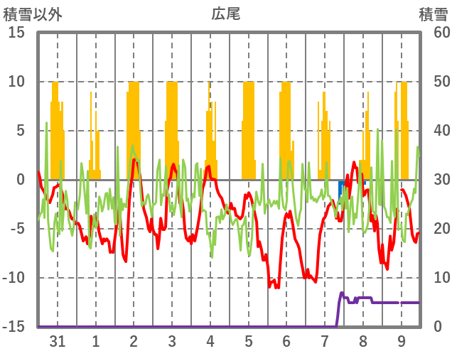 | 日 | 時 | 気温 | 降水 | 風向/風速 | 日照 | 積雪 | 降雪 |