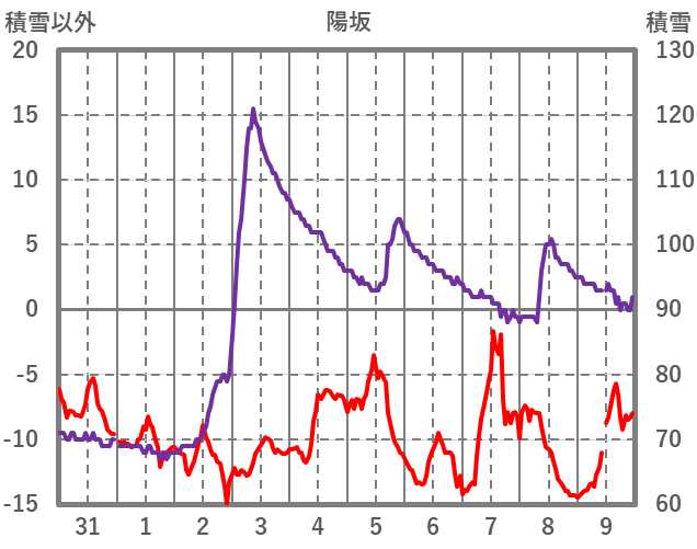 | 日 | 時 | 気温 | 降水 | 風向/風速 | 日照 | 積雪 | 降雪 |