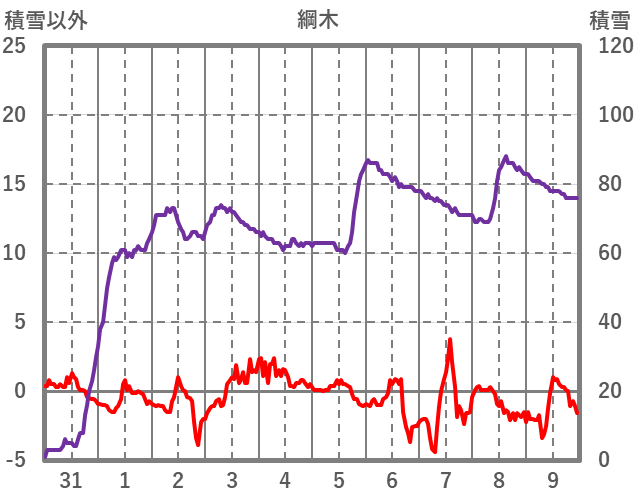 | 日 | 時 | 気温 | 降水 | 風向/風速 | 日照 | 積雪 | 降雪 |