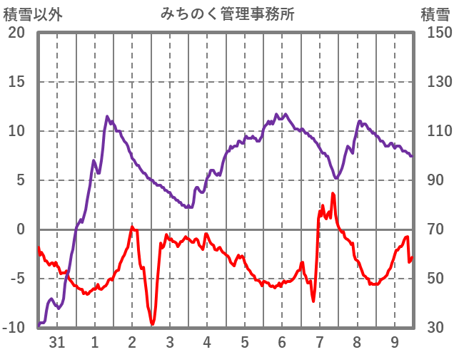 | 日 | 時 | 気温 | 降水 | 風向/風速 | 日照 | 積雪 | 降雪 |