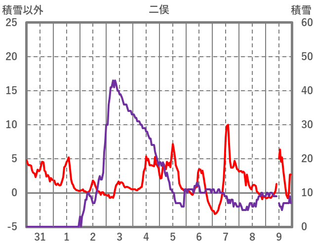 | 日 | 時 | 気温 | 降水 | 風向/風速 | 日照 | 積雪 | 降雪 |