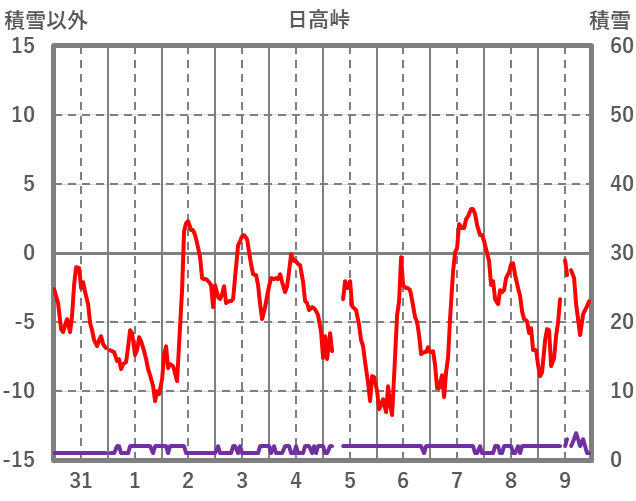 | 日 | 時 | 気温 | 降水 | 風向/風速 | 日照 | 積雪 | 降雪 |