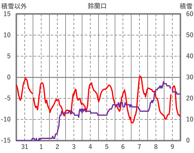 | 日 | 時 | 気温 | 降水 | 風向/風速 | 日照 | 積雪 | 降雪 |