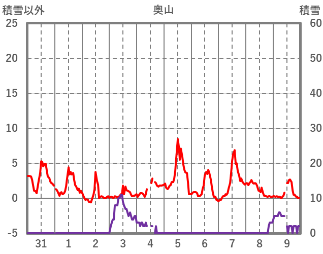 | 日 | 時 | 気温 | 降水 | 風向/風速 | 日照 | 積雪 | 降雪 |