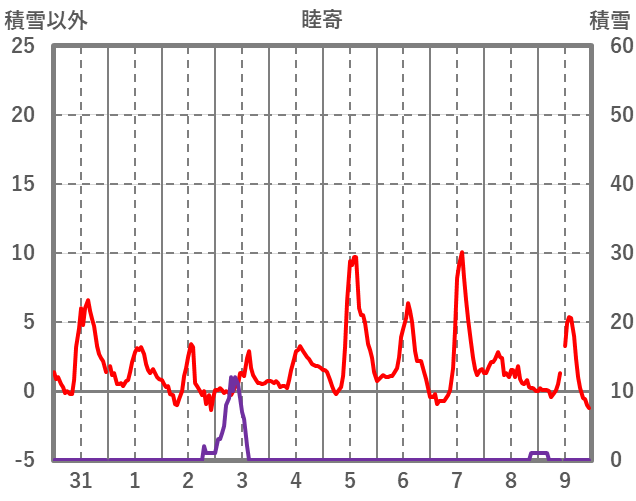 | 日 | 時 | 気温 | 降水 | 風向/風速 | 日照 | 積雪 | 降雪 |