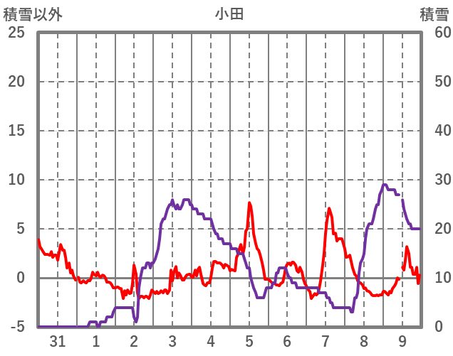 | 日 | 時 | 気温 | 降水 | 風向/風速 | 日照 | 積雪 | 降雪 |