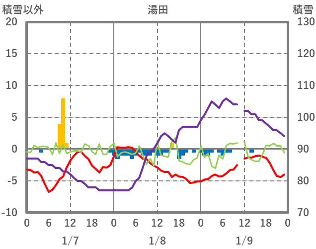 | 日 | 時 | 気温 | 降水 | 風向/風速 | 日照 | 積雪 | 降雪 |