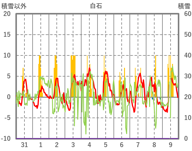 | 日 | 時 | 気温 | 降水 | 風向/風速 | 日照 | 積雪 | 降雪 |