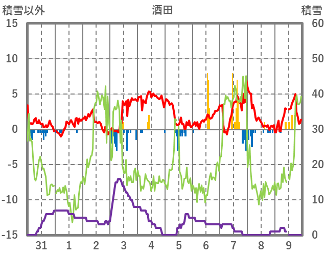 | 日 | 時 | 気温 | 降水 | 風向/風速 | 日照 | 積雪 | 降雪 |