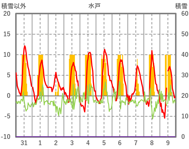 | 日 | 時 | 気温 | 降水 | 風向/風速 | 日照 | 積雪 | 降雪 |