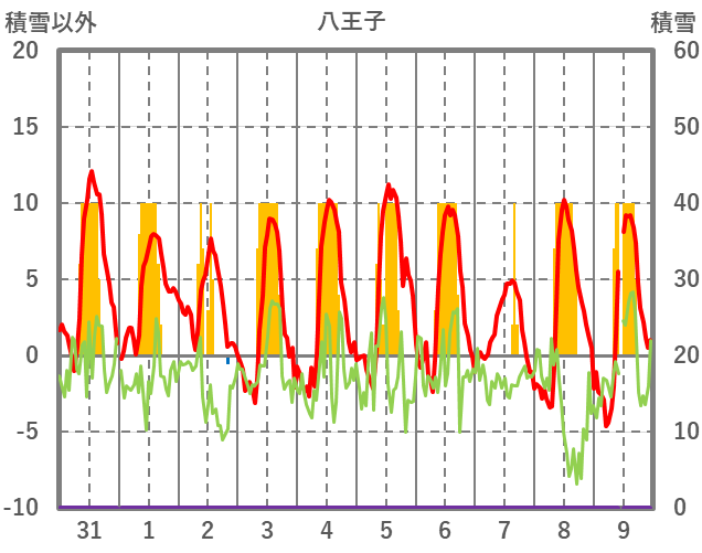 | 日 | 時 | 気温 | 降水 | 風向/風速 | 日照 | 積雪 | 降雪 |
