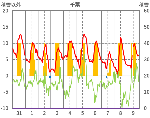 | 日 | 時 | 気温 | 降水 | 風向/風速 | 日照 | 積雪 | 降雪 |
