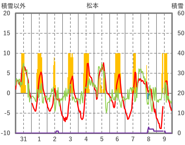 | 日 | 時 | 気温 | 降水 | 風向/風速 | 日照 | 積雪 | 降雪 |