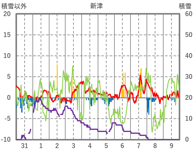 | 日 | 時 | 気温 | 降水 | 風向/風速 | 日照 | 積雪 | 降雪 |