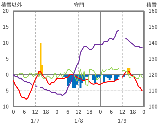 | 日 | 時 | 気温 | 降水 | 風向/風速 | 日照 | 積雪 | 降雪 |