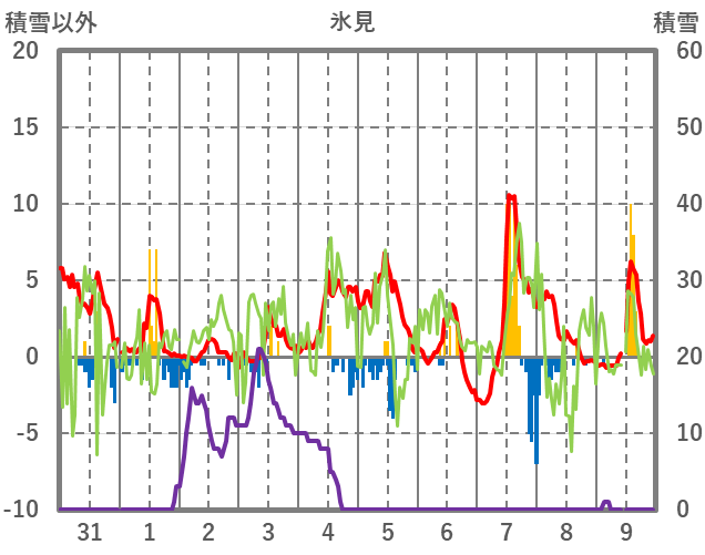 | 日 | 時 | 気温 | 降水 | 風向/風速 | 日照 | 積雪 | 降雪 |