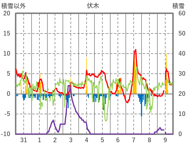 | 日 | 時 | 気温 | 降水 | 風向/風速 | 日照 | 積雪 | 降雪 |