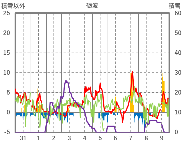 | 日 | 時 | 気温 | 降水 | 風向/風速 | 日照 | 積雪 | 降雪 |
