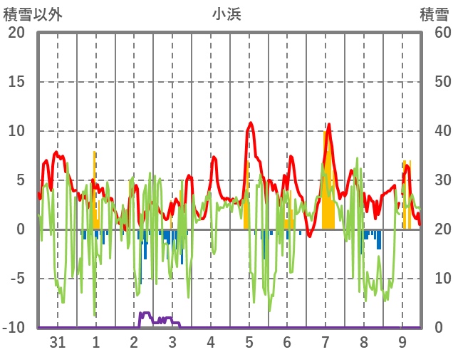 | 日 | 時 | 気温 | 降水 | 風向/風速 | 日照 | 積雪 | 降雪 |