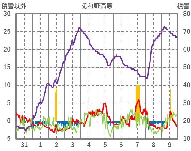 | 日 | 時 | 気温 | 降水 | 風向/風速 | 日照 | 積雪 | 降雪 |