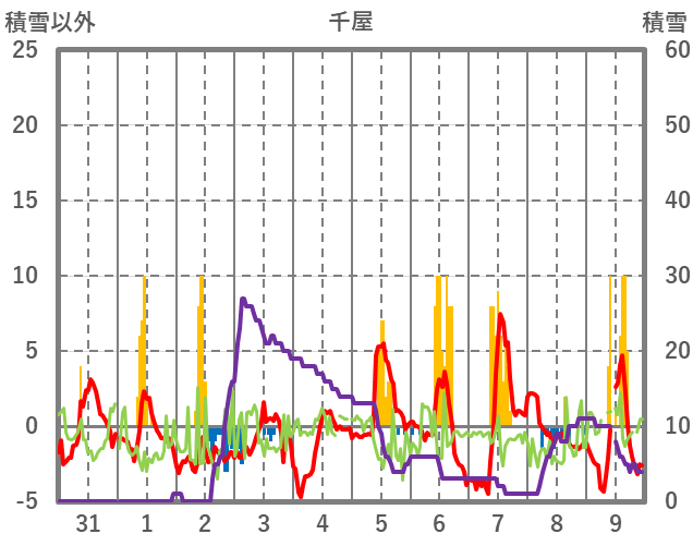 | 日 | 時 | 気温 | 降水 | 風向/風速 | 日照 | 積雪 | 降雪 |