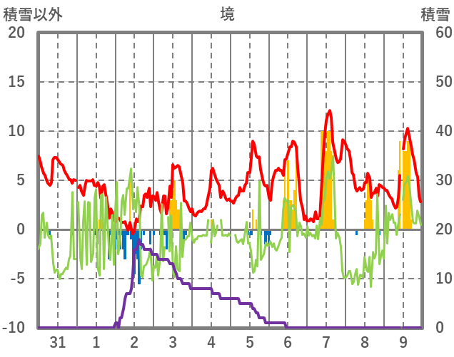 | 日 | 時 | 気温 | 降水 | 風向/風速 | 日照 | 積雪 | 降雪 |