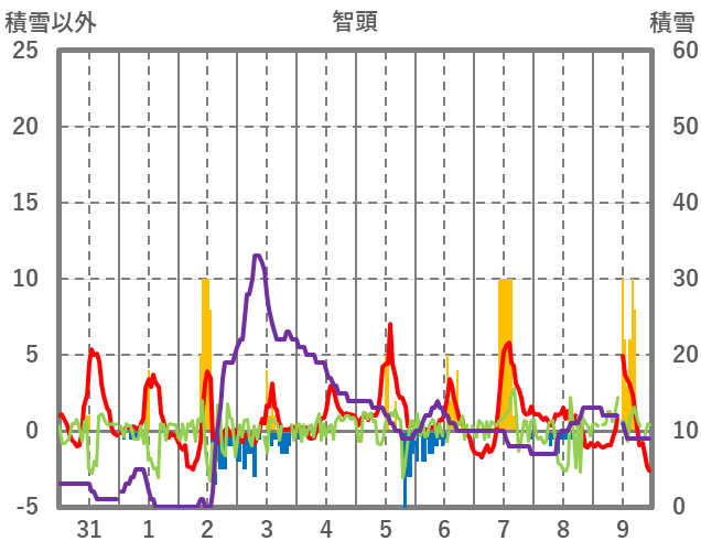 | 日 | 時 | 気温 | 降水 | 風向/風速 | 日照 | 積雪 | 降雪 |